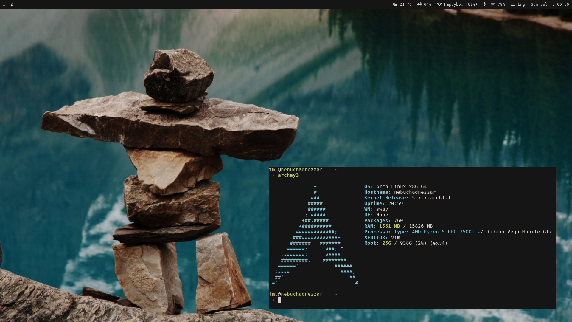 Credit for the terminal colors and parts of the zsh theme goes to crshd. The Nvim setup is based on ThePrimeagen's. Some of the remaining dotfiles are based on other people's work as well, but modified beyond recognition.