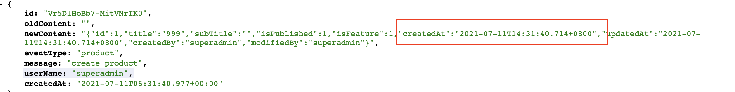 reproduct step: create product and compare the datetime in DB and auditlog API
