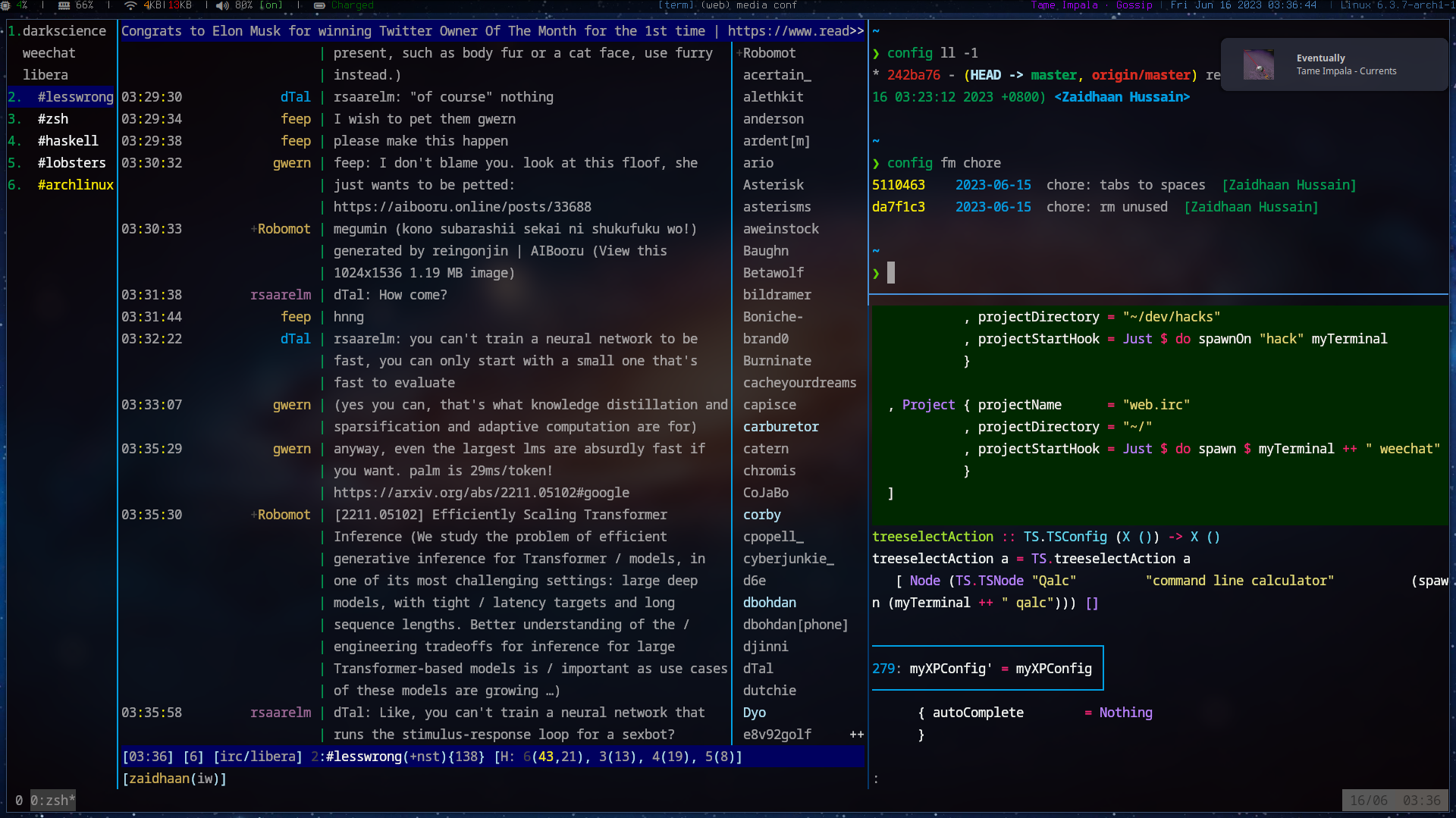 My dotfiles. This repository is currently only meant to be used by me (so I can safely make changes and revert back as necessary). I might eventually document this better and add screenshots so it's useful to others. (At the moment the only things useful to an outsider might perhaps be my zsh/.zshrc or xmonad/xmonad.hs)