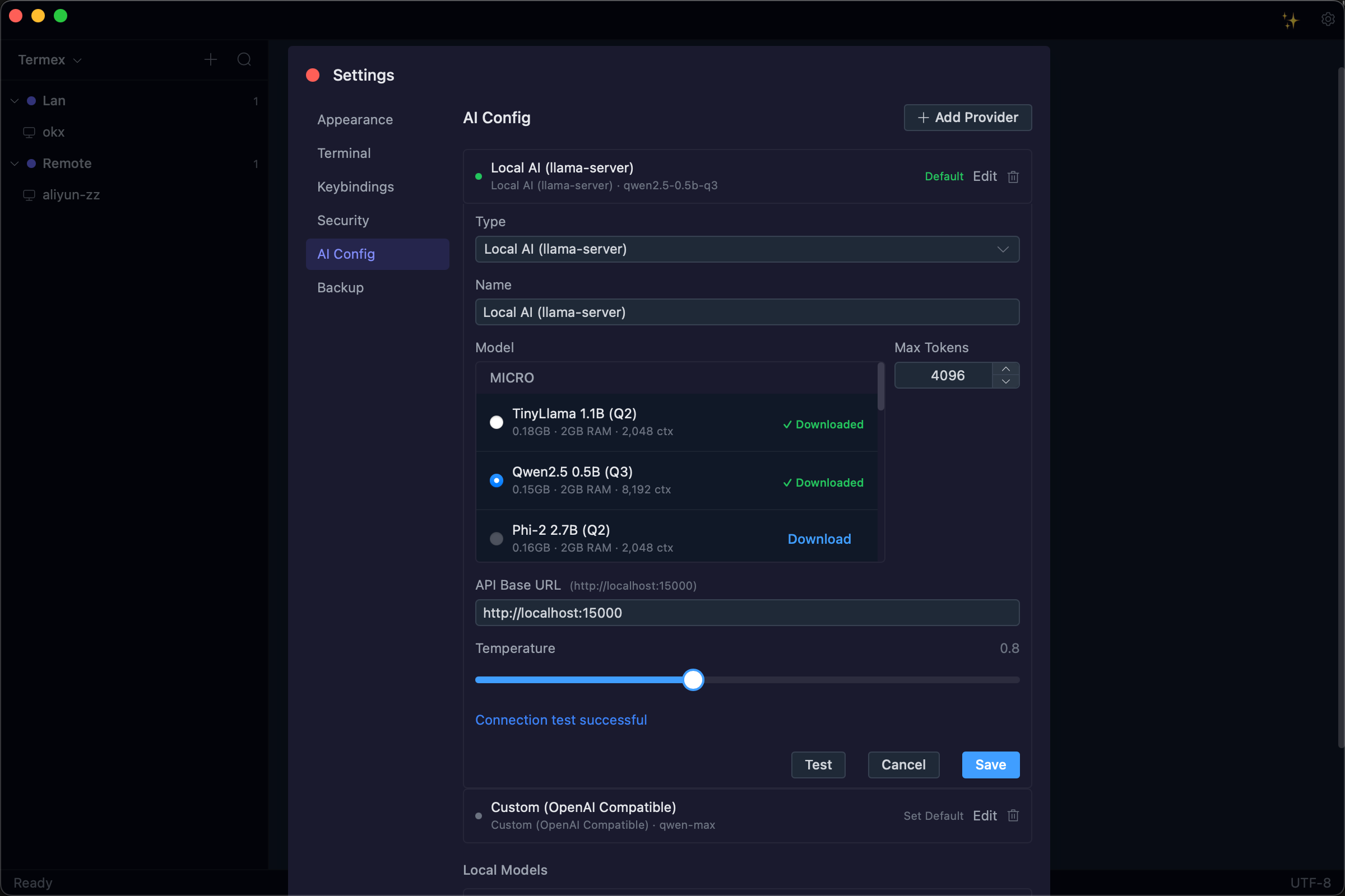 - Local AI -- Built-in llama-server with 12 GGUF models, fully offline, no API key required